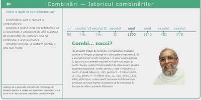 Combinările fac parte dintr-un capitol mai amplu al matematicii/informaticii, şi anume Combinatorica. Acesta se studiază îndeosebi la clasele a X-a cu profil matematică-informatică, atât la matematică, cât şi la informatică. Pe parcursul orelor celor două discipline am observat că elevii întâmpină dificultăţi în a întelege combinările, de aceea am considerat că un soft educaţional pe această temă, proiectat dintr-o perspectivă interdisciplinară, ar fi bine venit, ca mijloc complementar de învăţare. |