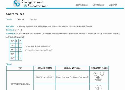 Conversiunea şi obversiunea Software educaţional Autori : Lucian-Andrei Bosînceanu şi Şerban Cobzac Prof. coordonatori: Ana-Maria Fuioagă, Emanuela Cerchez “Conversiunea și obversiunea » este o temă care face parte din capitolul "Raționamente" care se studiază la disciplina Logică în clasa a IX-a. Deoarece aceste operații constituie o temă mai complexă care este abordată la clasă în minim 3 ore, soft-ul educațional "Coversiunea și obversiunea" se dorește a fi o unealtă auxiliară pentru a ușura procesul de învățare. Acesta prezintă sintetizat și structurat ambele operații, fiecare fiind însoțită de exemple și aplicații relevante. Soft-ul are ca obiective atât fixarea cunoștințelor nou dobândite de elevi în vederea obținerii de rezultate foarte bune la o posibilă evaluare, cât și recapitularea acestor noțiuni pentru examenul de bacalaureat. |