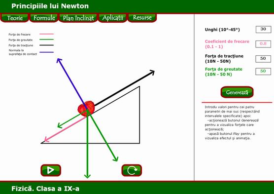 Principiile lui Newton Lucrarea „Principiile lui Newton” este un software educaţional pentru elevii claselor a IX-a care studiază disciplina Fizică. Aplicaţia noastră ilustrează cele 4 principii newtoniene prin câte un experiment simplu, efectuat în laborator. Punctul central al lucrării este studiul mişcării corpurilor pe planul înclinat. Lucrarea conţine un modul demonstrativ, în cadrul căruia elevii pot introduce valori pentru forţa de tracţiune, forţa de greutate, coeficientul de frecare şi respectiv unghiul planului înclinat şi pot studia efectul, urmărind simularea mişcării. De asemenea, lucrarea conţine şi un modul de aplicaţii în cadrul căruia generăm probleme referitoare la mişcarea corpurilor pe plan înclinat: 3 dintre parametrii care caracterizează mişcarea sunt fixaţi, iar elevul trebuie să determine o valoare pentru cel de al patrulea parametru astfel încât să obţină un anumit efect de mişcare specificat. Lucrarea a fost dezvoltată în cadrul Şcolii de vară InfoFizica 2011. |