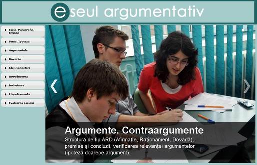 Eseul argumentativ Autori: Lucrarea constă într-un site educaţional ce vine în ajutorul elevilor de liceu pentru a învăţa/aprofunda modul în care trebuie realizat un eseu argumentativ. Structurat în 9 momente (capitole), site-ul oferă elemente de teorie, însoţite de exerciţii necesare pentru aprofundarea noţiunilor de enunţ şi paragraf, precum şi a noţiunilor specifice eseului argumentativ (dovezi, argumente, conectori). În final, este inclus un modul de evaluare, care testează abilitatea elevilor de a evalua un eseu argumentativ pe baza cunoştinţelor dobândite. |